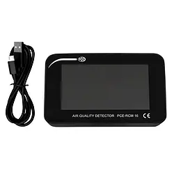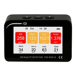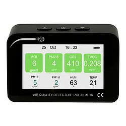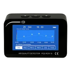 The air quality meter PCE-RCM 16 is suitable for monitoring air quality in homes, businesses, or public buildings. It features a 4.3-inch TFT display that allows easy reading of all measured values. The meter supports measurements of CO2, TVOC, PM1, PM2.5, PM10, temperature, and humidity. The measured values are updated in real-time and visually indicate if any value exceeds the set limit.