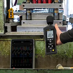 The Bluetooth decibel meter is suitable for both Android and iOS devices. It has an accuracy class of 2 and a measuring range from 30 to 130 dB. The meter can be used to record noise levels in various environments, such as stamping presses, ventilation systems, and busy roads. It features frequency weighting options, A and C, which can be easily switched with the push of a button. The meter also has a data logger function that can store up to 32700 readings. It can be mounted on a tripod for optimal microphone positioning.