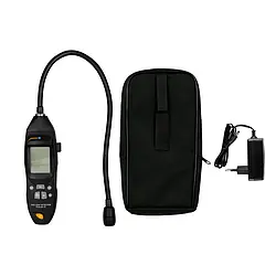 Flammable gas detector with rechargeable battery, audible alarm, semi-rigid 400 mm probe, and durability of the probe approximately 5 years. It also features a vibration alarm and can display measured values up to 10000 ppm. The gas detector can operate on both battery and mains power.