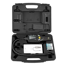The sensor is arranged at the head of a semi-rigid 40 centimeter long hose so that it can be easily guided to the component to be tested. To search for leaks, the sensor is slowly moved as close as possible along the points to be examined. If the gas detector detects a leak, an alarm tone sounds and additional indicator LEDs light up. The higher the recorded hydrogen concentration compared to the base level, the more indicator LEDs light up.