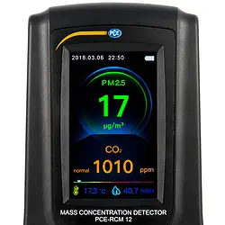 The particle counter PCE-RCM 12 is used for indicative testing of environmental parameters. It enables the measurement of CO2, fine dust, temperature, and relative humidity. The bright display provides information about these parameters. Environmental monitoring can be done continuously for up to five hours without the device being connected to a power source.
