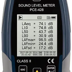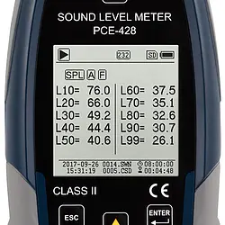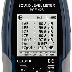 The peak hold function in the sound level data logger makes it possible to record the maximum sound pressure level during long-term measurements and freeze it in the display. A 24 bit AD converter and the specially developed electronics of the sound level meter help to reduce the inherent noise to a very low level. Sampling the measurement signal with more than 48 kHz enables high accuracy and improved stability of the measurement value on the sound level meter.
