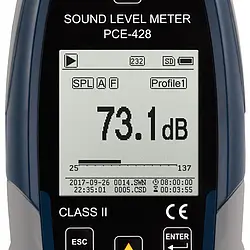 The sound level data logger is an optimal sound level meter for measurements at workplaces, construction sites, in traffic, airports, etc. The sound level meter is a class 2 device and is equipped with an octave band frequency filter. The sound level meter can optionally be upgraded with a 1/3 octave band filter. In addition to the numerical display of the measured value, a graph can show the course of the sound level. The sound level meter has various frequency weightings such as A, B, C and Z. The sound meter can also display measurements with the time weightings Fast, Slow, Impulse and Peak. The measuring range of the sound level meter extends from 25 … 136 dbA at a frequency of 20 Hz … 12.5 kHz. 3 different measurement profiles can be stored in the sound level meter. Here the user can decide which parameters the sound level meter should record. For example, you can choose between Laeq, LcPeak, LaFmax, LaFMin, etc.